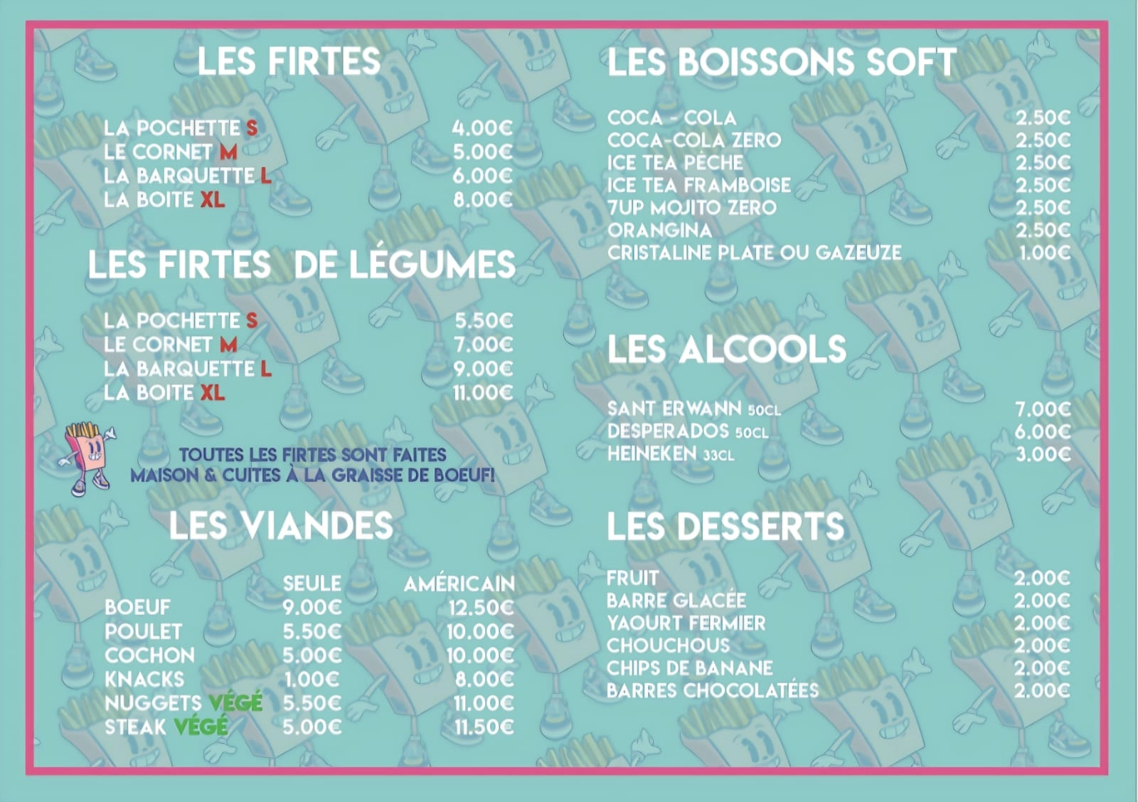 Bœuf, poulet, knacks ou végé, il y en a pour tous les goûts ! Et ce n’est pas fini : mes frites dorées à la graisse de bœuf ou mes frites de patate douce font un carton. Préparées avec des pommes de terre locales de chez La Frite Forestoise, elles sont les vraies stars du menu. À la carte ou en formule, sans oublier les desserts gourmands et les boissons fraîches pour compléter votre repas !